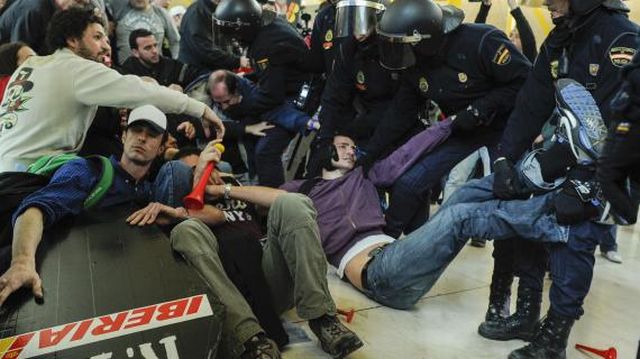 Quelques milliers de salariés de la compagnie espagnole (21 000 selon certaines sources), ont voulu forcer le passage dans le terminal T4 de l’aéroport de Barajas, avant d’être repoussés fermement par la police.
