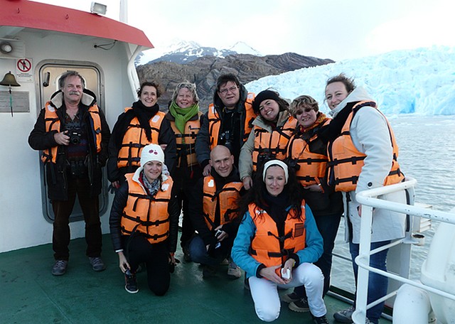 A bord du bateau sur le lac Grey : Peyo d’Andurain (Anapia Voyages), Elisabeth Boaventura (LATAM Airlines Group), Emmanuelle Delbecq (Kuoni), Gilles Bienfait (Les connaisseurs du Voyage), Julie Chelli (Les Ateliers du Voyage), Elisabeth Dumont (Terres de Charme), Déborah Furey (Terres Lointaines), Cécile Lacroute (OT Chili), Cédric Faivre Rampant (Verdié Voyages) et Armelle Lalande (Club Med).